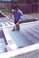 The minimum infrastructure needed is a roof, a small storage area for cement and tools, a water tank to cure the tiles and, of course, a small yard to store sand and the finished tiles. Some people producing in their backyard have invested less than $US 500 for infrastructure.