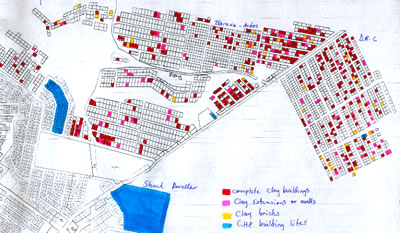 As the informal sector is not fully mapped, we had to draw a detailed map of some areas. We walked through the entire informal sector of Orwetoveni, counting every plot, with or without clay activity. We distinguished between complete clay buildings, clay extensions or walls and clay bricks. ![]() The squatter settlements in Otjiwarongo have grown 500% in the last five years. At first, the shacks were built right next to the cemetery and close to main roads. As more and more people arrived, the area grew larger and now extends to the end of the which has been built during the last three years. Earlier research about the same theme was done by the CHP in 1995, when they counted around 270 plots and found only seven clay buildings. At that time people were not allowed to build with clay in temporary areas. Later on, permission was granted to build in those areas. In the area recently investigated, we counted 2077 plots. In total we found 310 complete clay buildings. They only differ in size; sometimes it is the main house on the plot and in other cases it is just a small toilet. There were even a few houses that were plastered and some were even painted. We also found 85 plots with clay extensions or walls and 34 plots that were storing clay bricks. This means that on 20.65% of the plots counted, people were actually building with clay. In the area most recently built up, it is even 22.74%. As we walked past six building sites in that area, we noted that on five they were building with clay and only one plot owner was building a metal shack. ![]() The research revealed that the Clay House Project has a big impact on the local population. More and more people are choosing to live in clay houses instead of metal shacks. While it is clear to us that these clay buildings often look more like clay shacks, they are still an improvement. These clay shacks dont have foundations and the width of the walls does not exceed 20 centimetres. The advantage is that the people hire builders to build their houses because it is still cheaper than to buy metal sheets. This means that the money stays within the area and improves the local economy. |