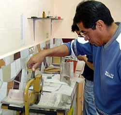 Early next morning, the work continued at the Ecomaterials plant, and Pedro began the intensive training by spending some time at the tile-making machine, then laboratory tests (flexion tests, granulometry, etc). Again the evening became the time for wide-spread discussions about the future of MCR in Colombia and the inter-institutional linking with EcoSur. Cali´s workshop was proposed as a pilot workshop reflecting the workshop in Riobamba to provide training courses for future plants. The use of the EcoSur Certificate of Quality and the inclusion of MCR in curriculums were also considered.